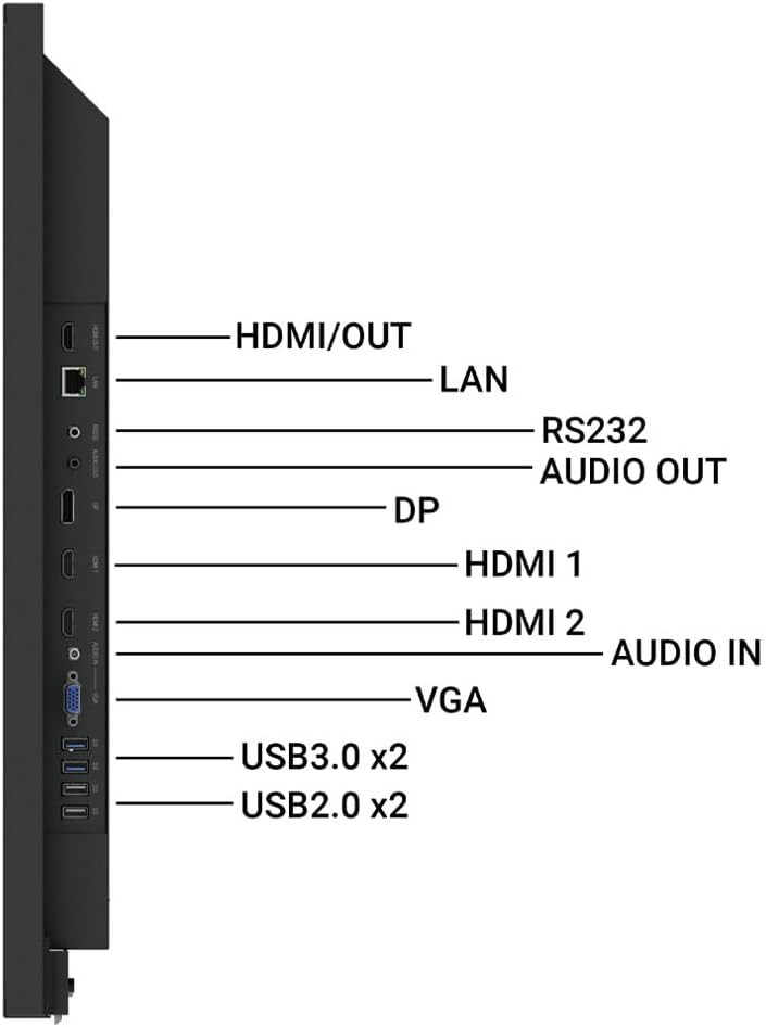 Color: black; Size: 43; Backlight: LED; Resolution: 3840x2160; Active area: 941.2mm × 529.4mm; Brightness: 500 nits; Contrast: 1200:1; Response time: 8ms (typ.); Viewing angle (H/V CR=10): 178/178; Color gamut: 72%; Video I/F: VGA, HDMI inx2, DP; RS232, RJ45, USBx4; Speaker: 10Wx2; Remote controller, Pantone validated