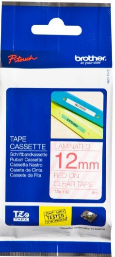 **TZe-132 öntapadós laminált címkeszalag tartós feliratok nyomtatásához.** * Szalag típusa: Standard laminált * Szalag szélessége: 12 mm * Szalag hossza: 8 m * Szalag színe: átlátszó * Felirat színe: Piros