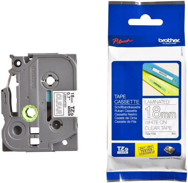 **TZe-145 öntapadós laminált címkeszalag tartós feliratok nyomtatásához.** * Szalag típusa: Standard laminált * Szalag szélessége: 18 mm * Szalag hossza: 8 m * Szalag színe: átlátszó * Felirat színe: Fehér