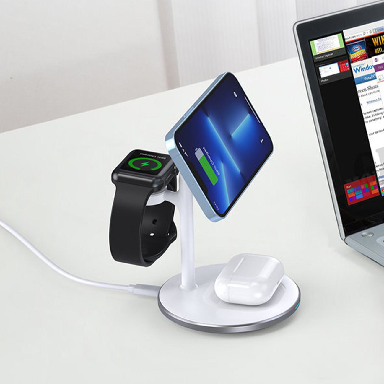 A Choetech 3 in 1 vezeték nélküli töltőállvány egyszerre több kompatibilis eszköz kényelmes töltését támogatja, így rendezettebbé teszi az asztali környezetet. Asztali, állvány kialakítása ideális mindennapi használatra, miközben a mobiltelefon, az okosóra és egy további eszköz töltése egy helyen történhet.