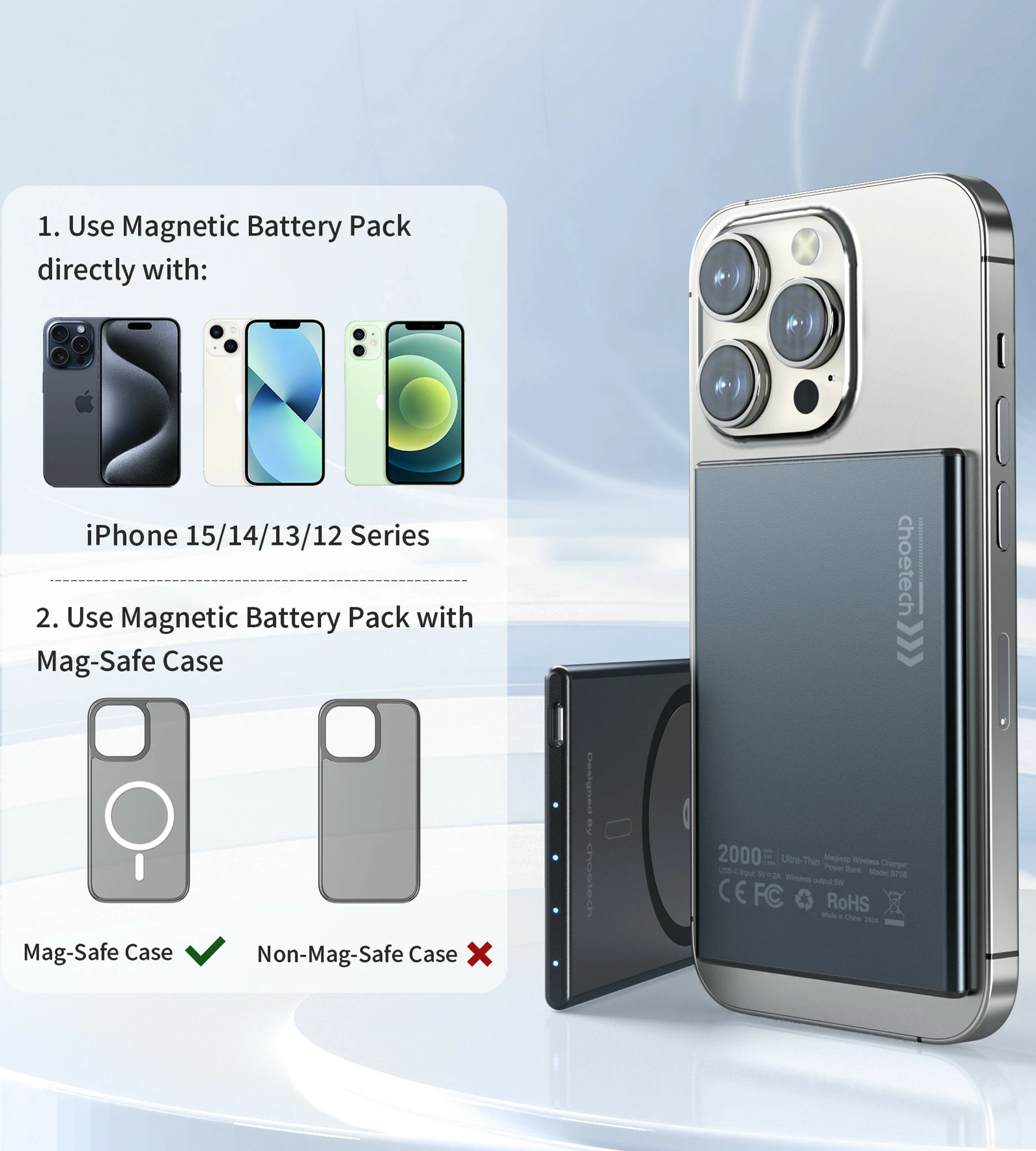 A Choetech B708 egy mindössze 5,5 mm vastag, hitelkártya méretű powerbank, amely könnyedén elfér zsebben, táskában vagy akár egy kisebb rekeszben is. A 2000 mAh kapacitás ideális vészhelyzeti tartalékot nyújt, ha nap közben gyors energiapótlásra van szükséged.