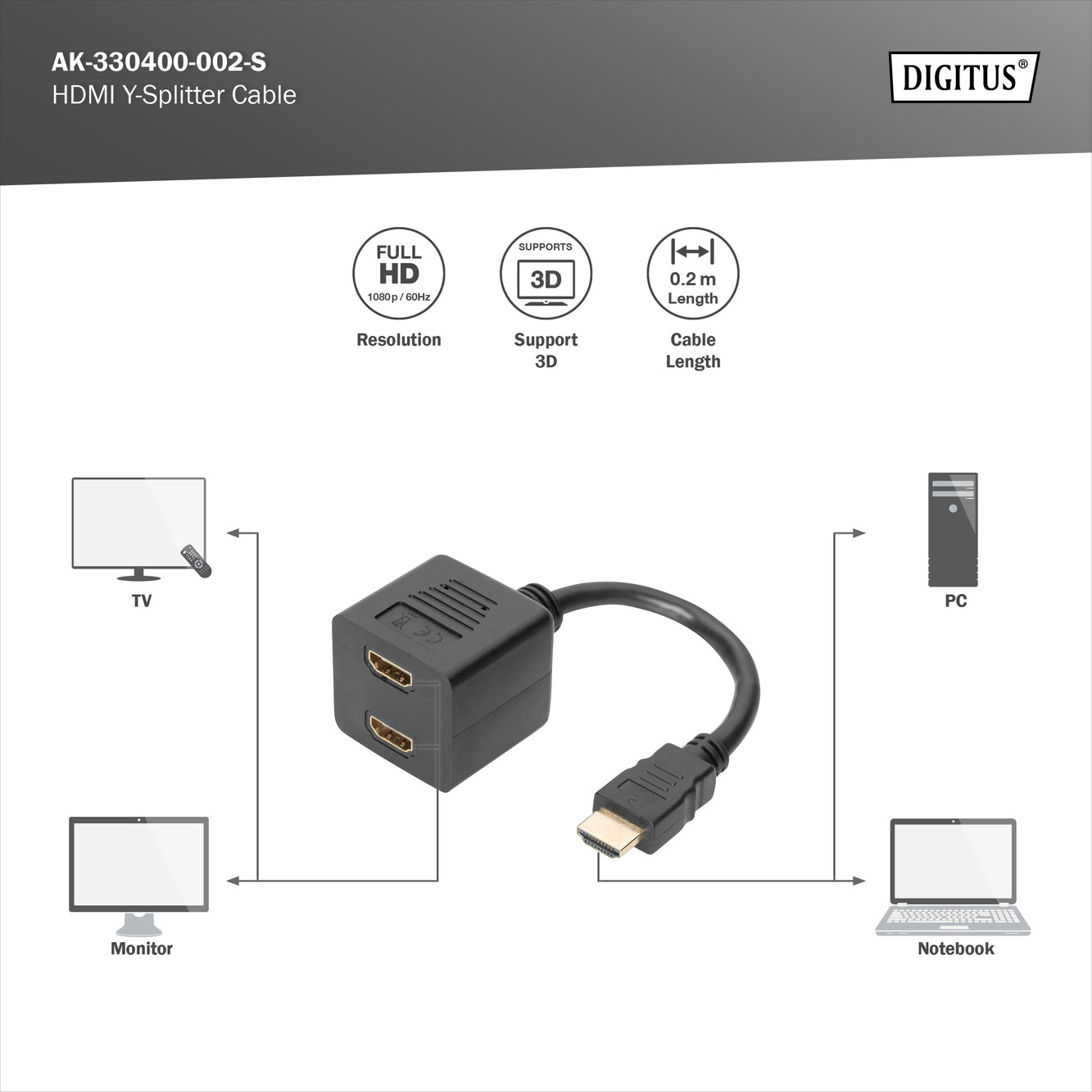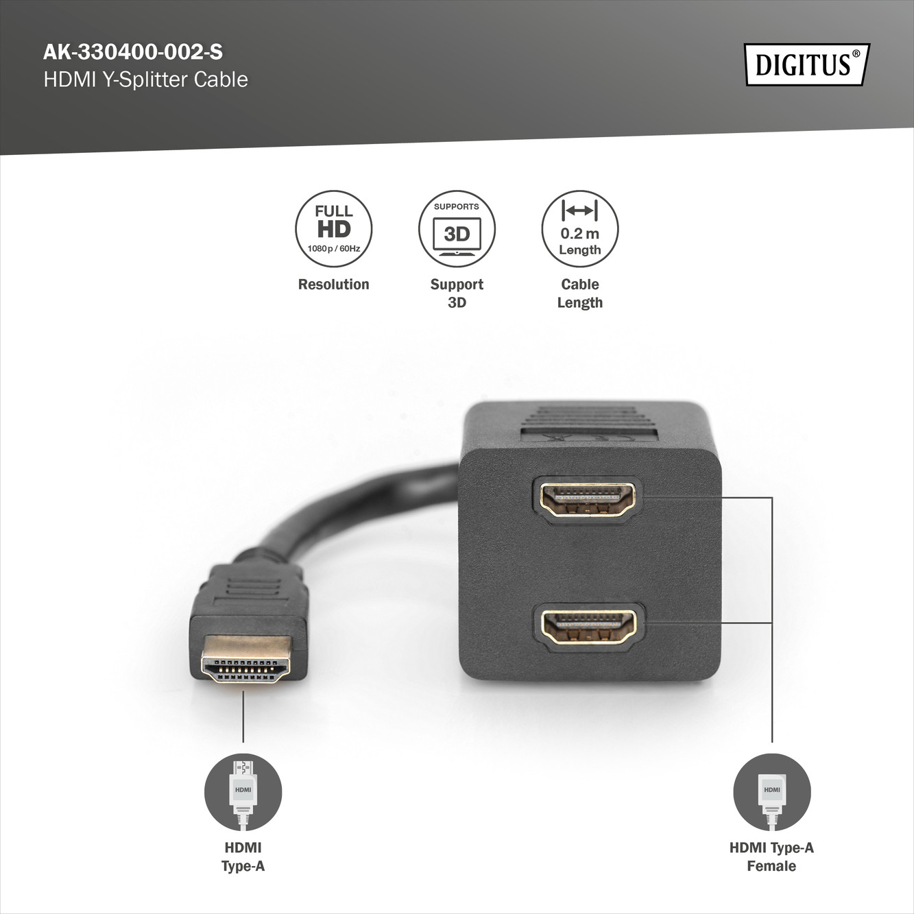DIGITUS AK-330400-002-S Full HD 3D 24Hz aranyozott HDMI Y-elosztó kábel 0,2m