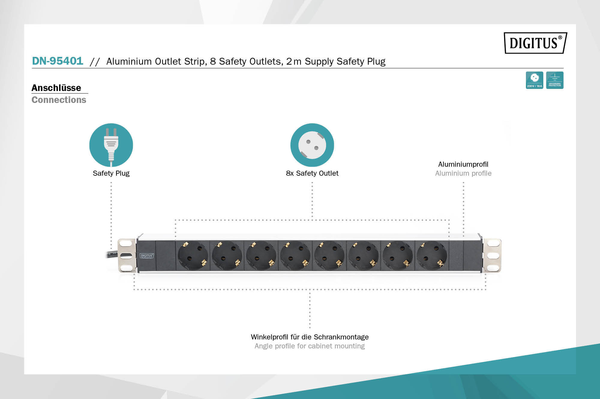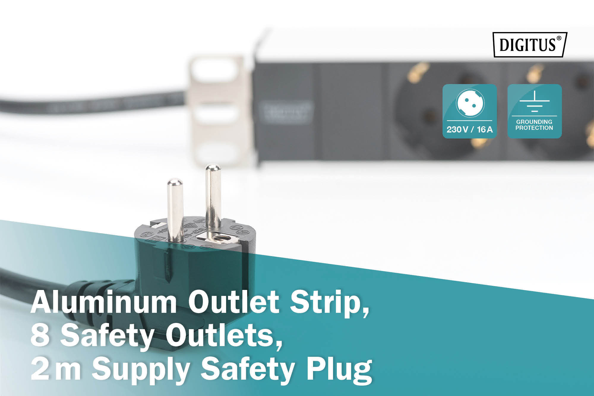 DIGITUS DN-95401 19" 1U PDU 8xCEE 7/3 schuko aljzat CEE7/7 csatlakozó 2m elosztósor
