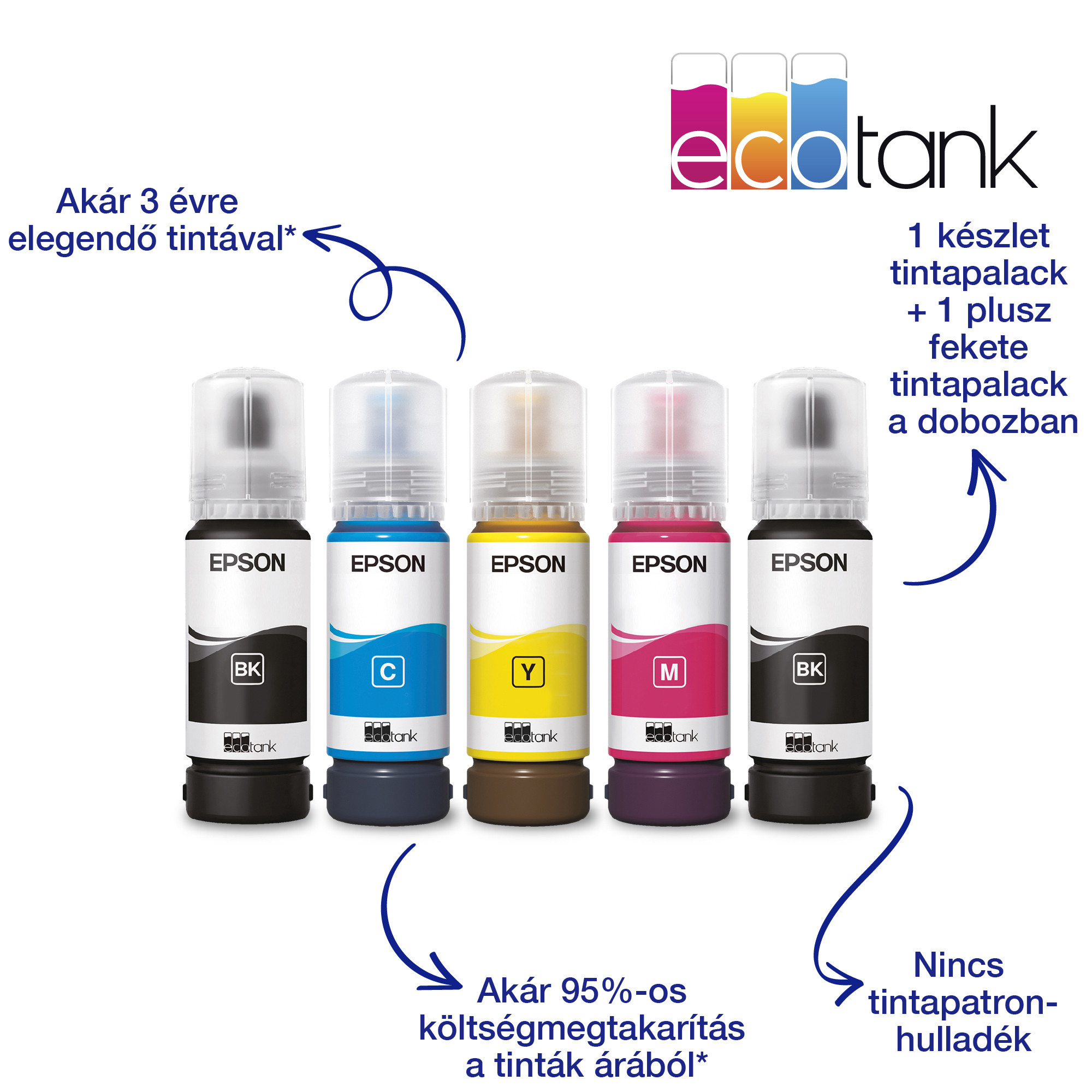 **Regisztráció esetén 3 éves kiterjesztett garancia elérhető 2025.03.31-ig! Az igényléseket a termék (végfelhasználói) vásárlásától számított 30 napon belül kell beküldeni! Regisztráció és részletek: https://www.epson.hu/hu_HU/promotions/extended-warranty *Multifunkciós: nyomtat, beolvas, másol *Nyomtatási sebesség ISO: 10 lap/perc mono, 5 lap/perc színes, 69 mp 10x15 cm-es fotónként *Nyomtatási felbontás: 5.760 x 1.440 dpi *Tinták: No.103, DYE/VÍZBÁZISÚ, 4 szín: black, cyan, magenta, yellow *Szkennelési sebesség (A4-es): mono: 11mp/lap, színes: 28mp/lap, max.felbontás: 1.200 x 2.400 dpi, formátumok: BMP, JPEG, PICT, TIFF, multi-TIFF, PDF, PNG *1 papírtálca: 100 normál lap, kiadó tálca: 30 lapos *Szegély nélküli nyomatok (10 x 15 cm-ig) *Papírsúly: 64 g/m2 - 300 g/m2 *LCD kijelző: színes, 3,7cm átlójú *Csatlakozók: USB, Wi-Fi, Wi-Fi Direct *Mobil és felhőalapú nyomtatási szolgáltatások: Epson Connect (iPrint, Email Print, Remote Print Driver), Apple AirPrint *A doboz tartalma: 4 db 65 ml-es, színenként cserélhető tintapalack (Bk,C,Y,M) + 1 db extra fekete tintapalack, Nyomtató meghajtó- és kiegészítő szoftverek (CD), Készülék, Tápkábel, Beállítási utasítás, Garancia dokumentum *A dobozban található palack(ok) kapacitása: fekete:kb.8.100 oldal, színes:kb.6.500 oldal *Garancia: 12 hónap vagy 30.000 oldal (bevivős/beküldős)