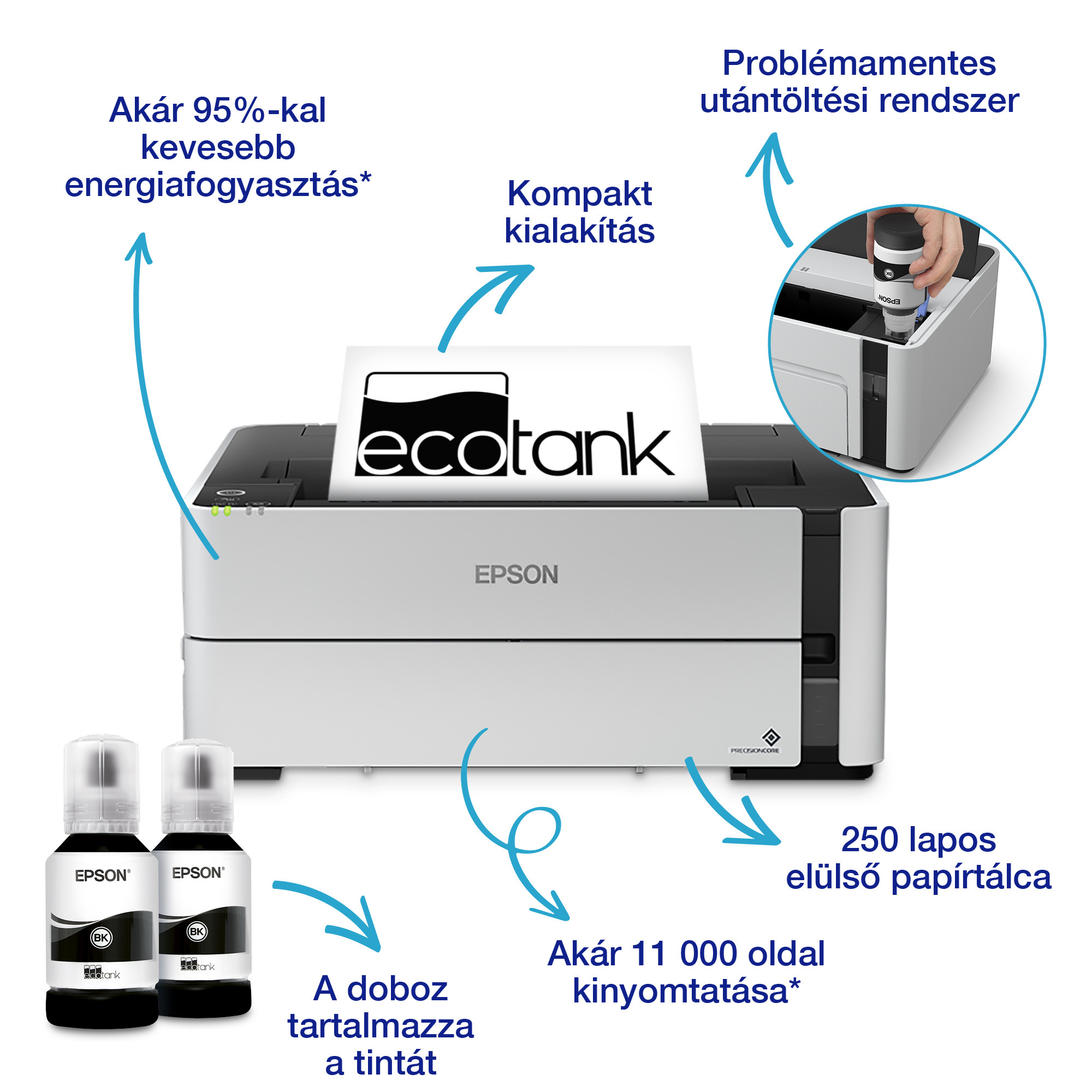 **Regisztráció esetén 3 éves kiterjesztett garancia elérhető 2025.03.31-ig! Az igényléseket a termék (végfelhasználói) vásárlásától számított 30 napon belül kell beküldeni! Regisztráció és részletek: https://www.epson.hu/hu_HU/promotions/extended-warranty *Nyomtatási sebesség ISO: 25 lap/perc *Nyomtatási felbontás: 1.200 x 2.400 dpi *Tinták: No.110 (120ml ~6K) vagy No.110S (40ml ~4K) PIGMENT; Maintenance BOX: T04D1 (C13T04D100) *Papírtálca: 250 lapos; kiemeneti tálca: 100 lapos *Automatikus kétoldalas nyomtatás (DUPLEX), Speciális médiához való hátsó adagolás *Papírformátumok: A4 (21.0x29,7 cm), Legal *Papírsúly: 64 g/m2 - 256 g/m2 *Csatlakozó: USB, Ethernet, Wi-Fi, Wi-Fi Direct *Mobil és felhőalapú nyomtatási szolgáltatások: Epson Connect (iPrint, Email Print, Remote Print Driver), Google Cloud Print *A dobozban található palackok össz. kapacitása: 11.000 oldal *A doboz tartalma: Készülék, Tápkábel, Warranty card, 2db tintapalack *Garancia: 12 hónap vagy 100.000 oldal (bevivős/beküldős)