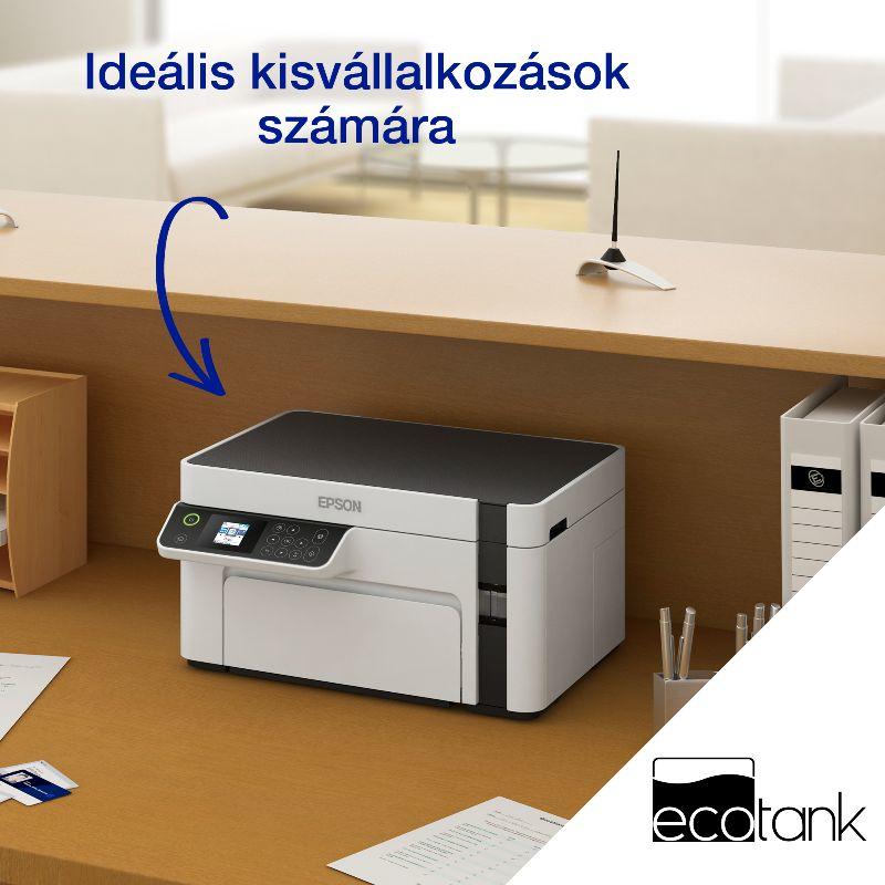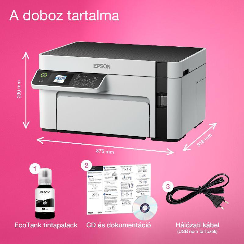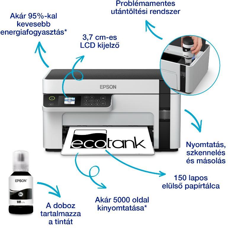 Az Epson EcoTank M2120 mono tintasugaras multifunkciós nyomtató ideális választás otthoni és kisebb irodai feladatokra, ahol fontos a nyomtatás, másolás és szkennelés egyetlen kompakt készülékben. A 15 lap/perc ISO fekete-fehér nyomtatási sebesség és az akár 1440 x 720 dpi felbontás tiszta, üzleti használatra is megfelelő dokumentumokat biztosít.