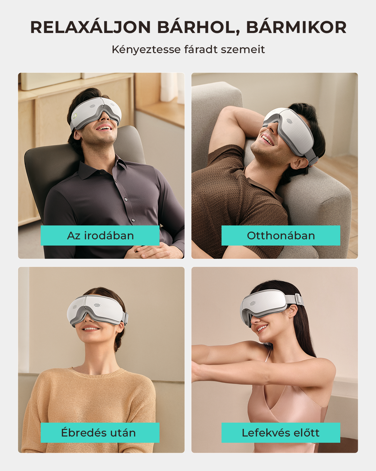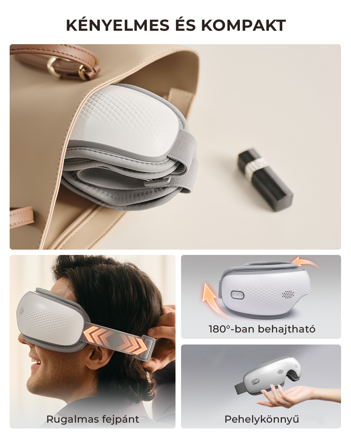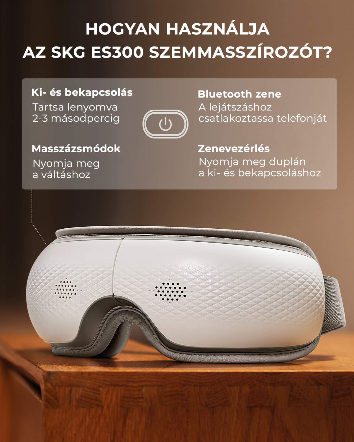 Az SKG ES300 szemmasszírozó a teljes szemkörnyéki területet átölelő légpárnás masszázzsal gondoskodik a maximális ellazulásról. A készülék szélesebb kialakítású, bőrbarát poliuretán anyaga nemcsak nagyobb felületen fejti ki jótékony hatását, de a fejlesztett, kényelmesen rugalmas pántokkal kiegészülve tökéletes illeszkedést is biztosít. A relaxációs élményt a beépített Bluetooth térhangzás teszi teljessé, miközben az eszköz mindössze 305 grammos súlya garantálja, hogy a használat közben szinte észrevehetetlen maradjon.