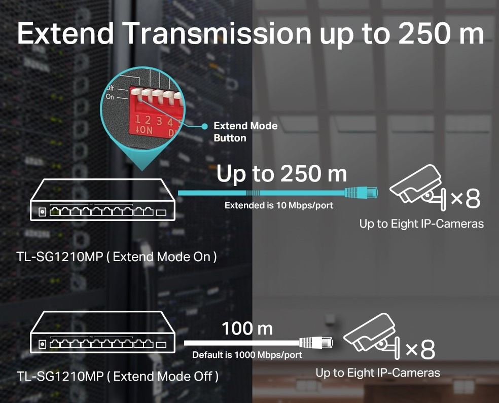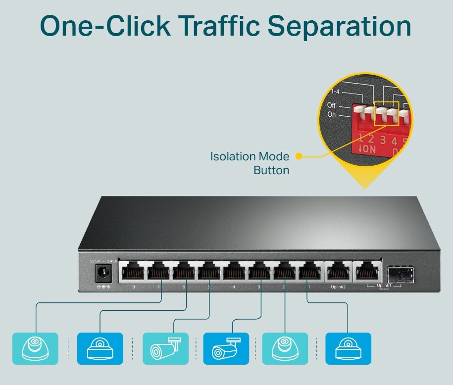 A 8× PoE portok egyetlen kábelen keresztül továbbítják az adatokat és az áramellátást 123 W-os teljesítménnyel