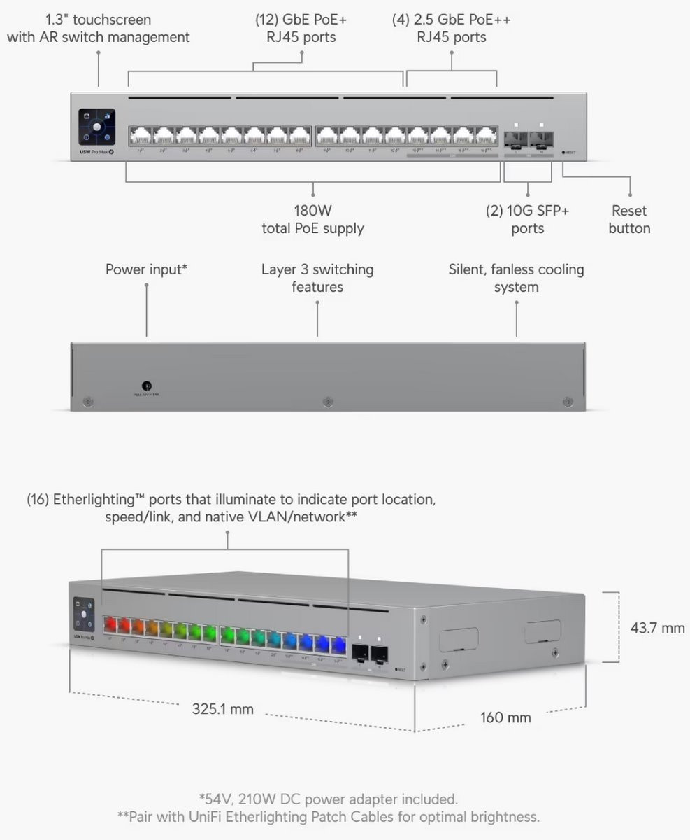 Ubiquiti USW-Pro-Max-16 12port GbE LAN 4x2.5GbE Multi-Gigabit LAN 2x SFP+ port L3 menedzselhető switch