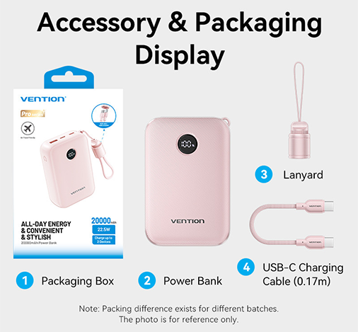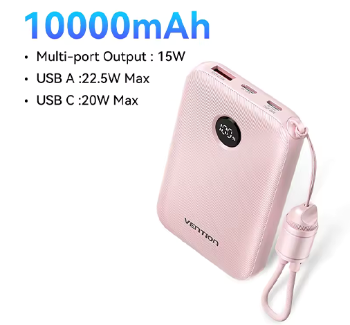 A Vention FKAP0-C 10000 mAh kapacitású powerbank ideális választás, ha megbízható tartalék energiára van szükség útközben vagy a hétköznapok során. Elegáns rózsaszín kialakítása mellett 22,5 W-os töltési teljesítményt kínál, így praktikus és stílusos kiegészítő egyszerre.