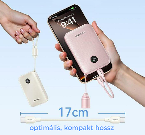 A csomagban található 17 cm-es USB-C kábel tökéletesen illeszkedik a powerbank kompakt méretéhez, így elkerülhető a felesleges kábelrengeteg. Ez az ideális hosszúság lehetővé teszi, hogy töltés közben is kényelmesen a kezedben tartsd a telefonodat az akkumulátorral együtt. A praktikus kialakításnak köszönhetően a hordozható energiaellátás valóban egyszerű és zavartalan marad.