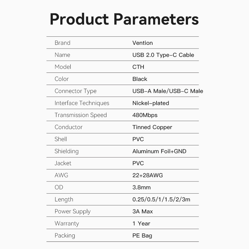 Vention USB-A 2.0/M -> USB-C/M, 2m,(3A,fekete), kábel